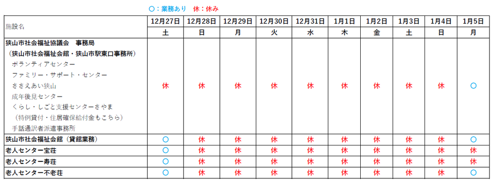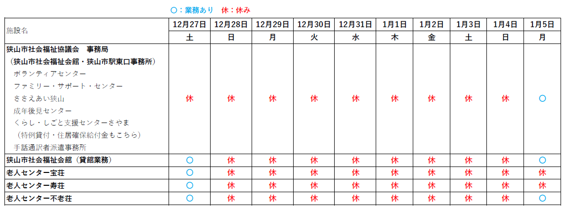 年末年始の休業日は下記の通りです。